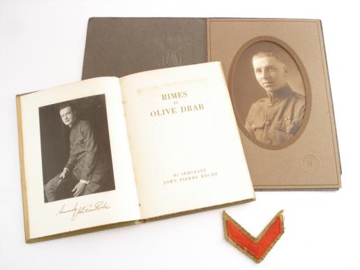 WW1 U.S Army Related Items Small group of WW1 U.S items. Soldiers uniform studio portrait, book of patriotic war poetry 'Rimes In Olive Drab' and a woollen discharge stripe.
