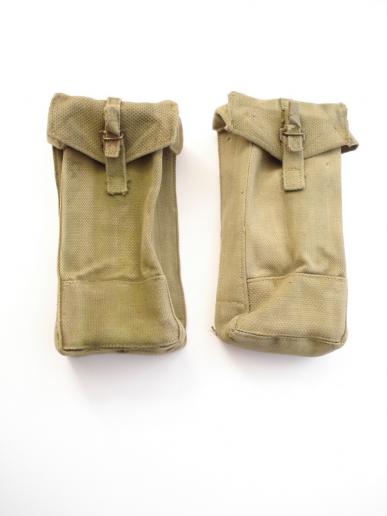Pair of WW2 1937 pattern webbing MkIII Basic pouches, good issued condition lightly Blanco'd with steel & Brass fittings. One dated 1944, the other indistinct. Good colour match.