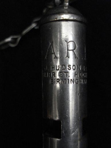 WW2 A.R.P Whistle & Chain Nice WW2 A.R.P whistle by J. Hudson & Co in good condition with original flat link chain & hook.