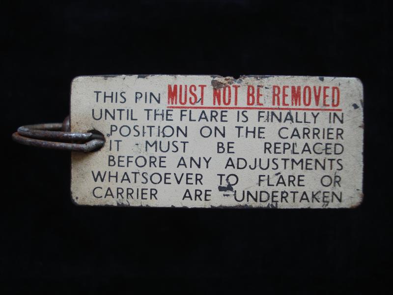 Scarce, WW2 safety split pin and printed steel tag for large air dropped target illumination flare. Very clean, all text clear, minor surface marks.