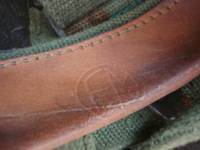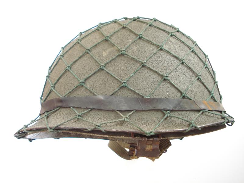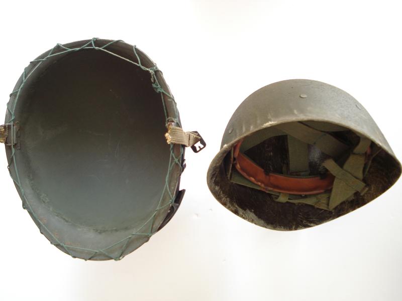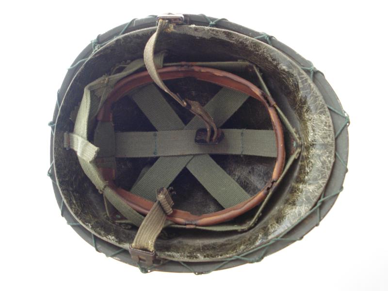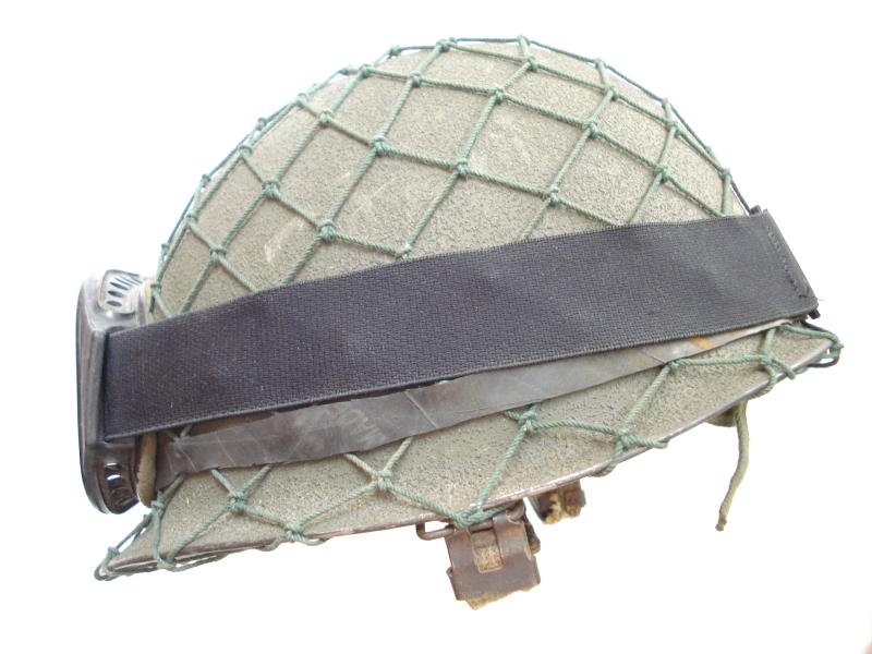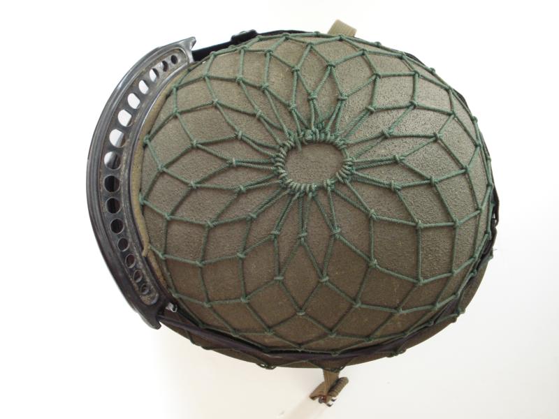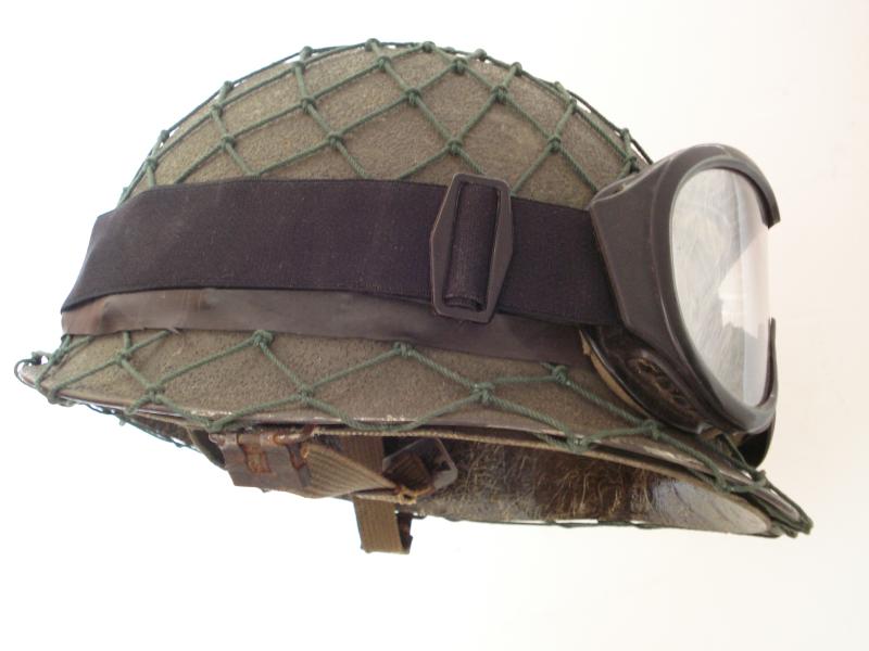 This is a 'home' produced example not reworked U.S or similar, the liner sweat band stamped FM (Fabricaciones Militares), distinctive green liner & webbing typical of Argentinian production. Fitted with 'lobster Pot' net with cut up inner tube camo band & French made dust goggles.