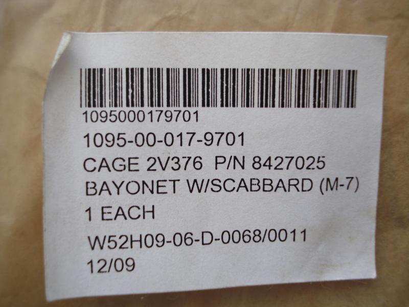 U.S issue M7 bayonet for the M16/M4 with original packaging in mint, un-issued condition. Bayonet produced by Ontario. Black M10 scabbard with integral frog.