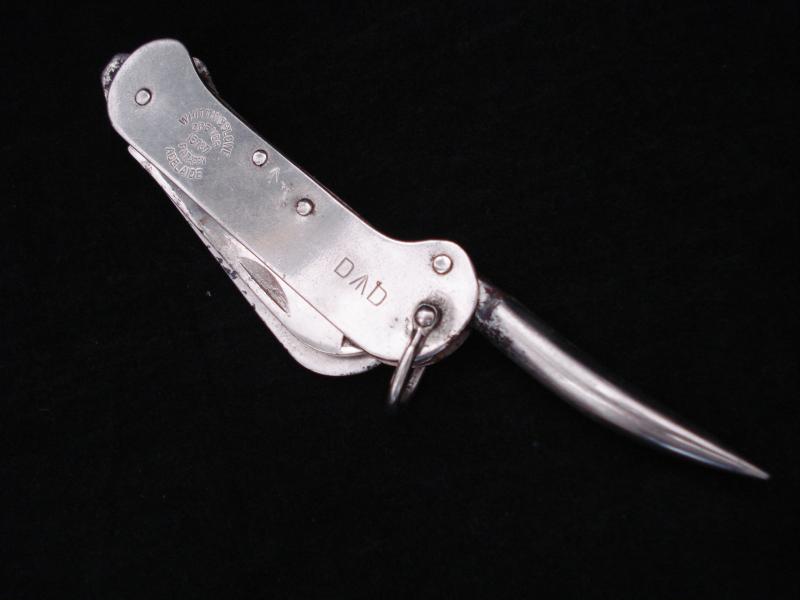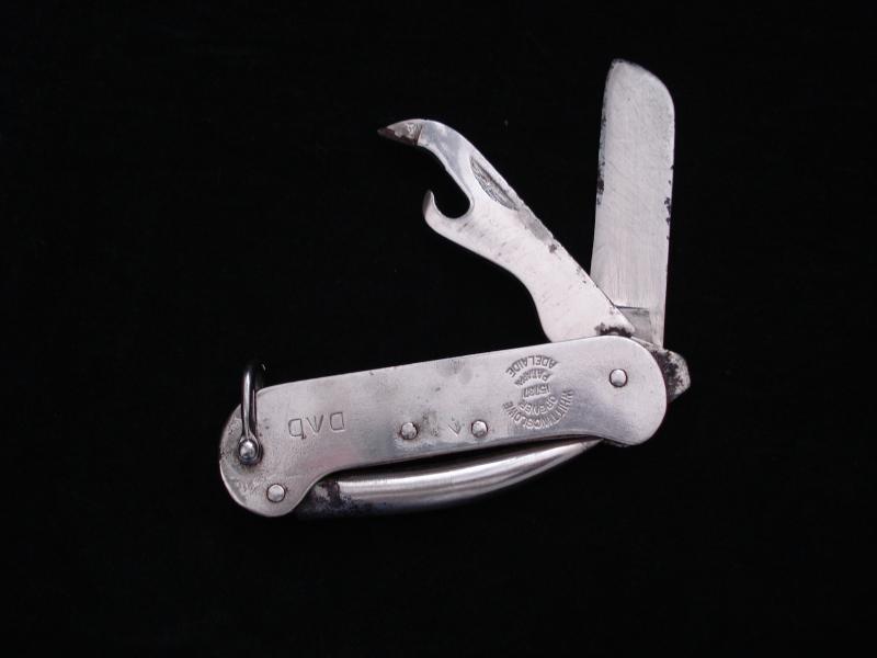 WW2 Australian issue clasp knife.Broad arrow & DD marked. Plated finish, 3 part knife, has a nice tight lock up. Plated finish lifting in places.