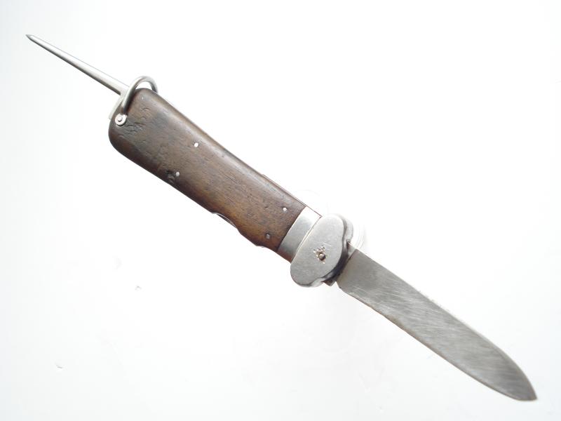 WW2 German gravity knife that has had the blade drilled & pegged to become a fixed blade knife. Not a recent conversion, carried out some time in the past, probably after the drop/lock mechanism was broken.