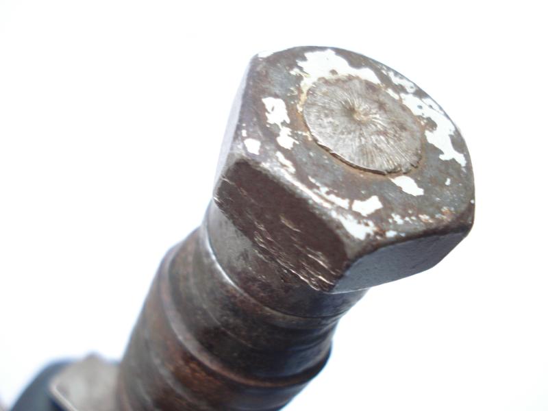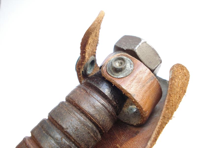 With a 5" saw backed blade, this example was made between 1961-1966. Excellent stacked leather grips, parkerized blade has good point and edge, no chips or nicks, some loss of finish & rust patches. No pommel dates on these early ones.