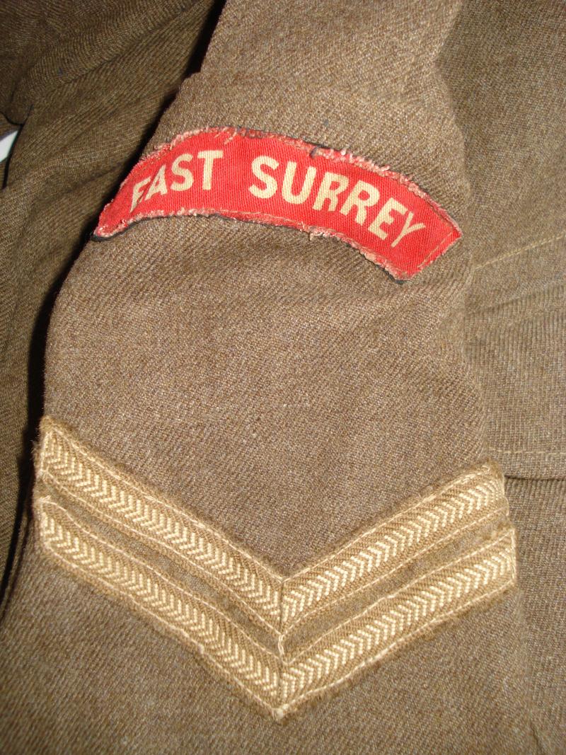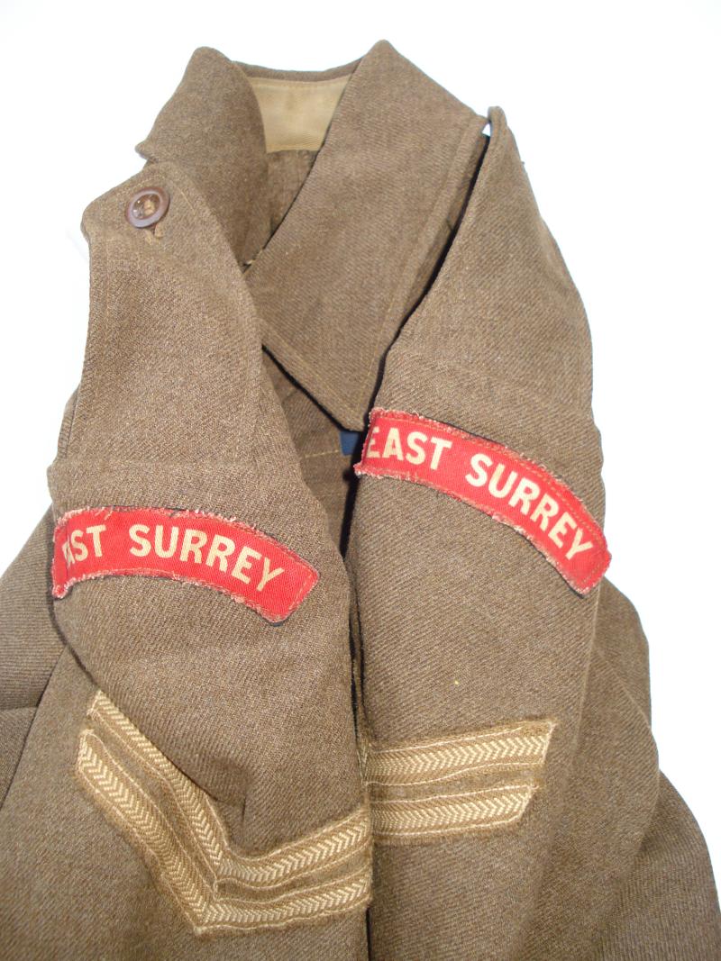This is the B.D he would have been repatriated in, it sports East Surrey shoulder titles, Rank stripes, six service stripes, medal ribbons, (Inc Burma star)
