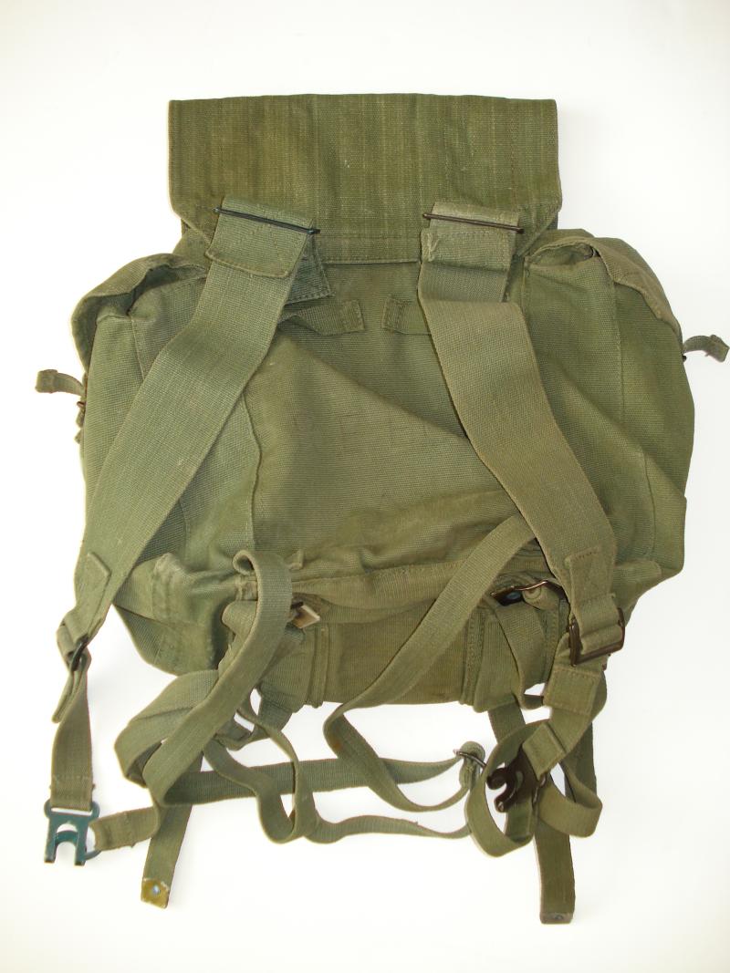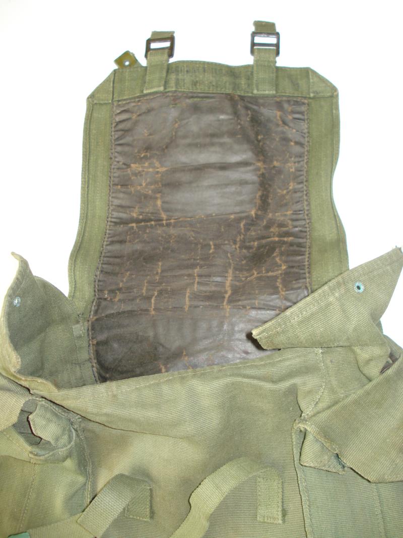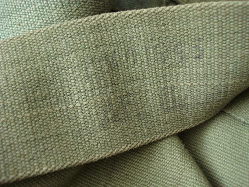 1945 dated P'44 1st type (Small) webbing haversack & L-straps. Good issued condition. no holes or repairs. All elements are '45 dated, now faint. Some age wear to the waterproof lining. All straps & fitting present.