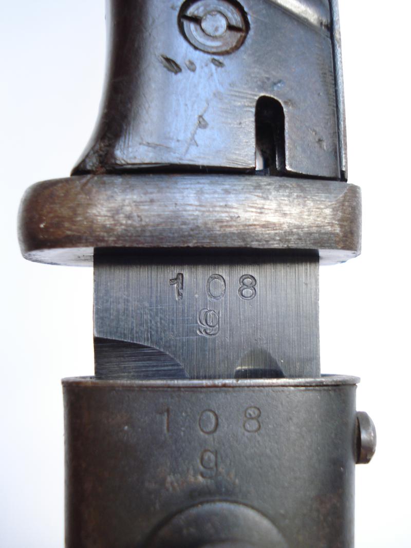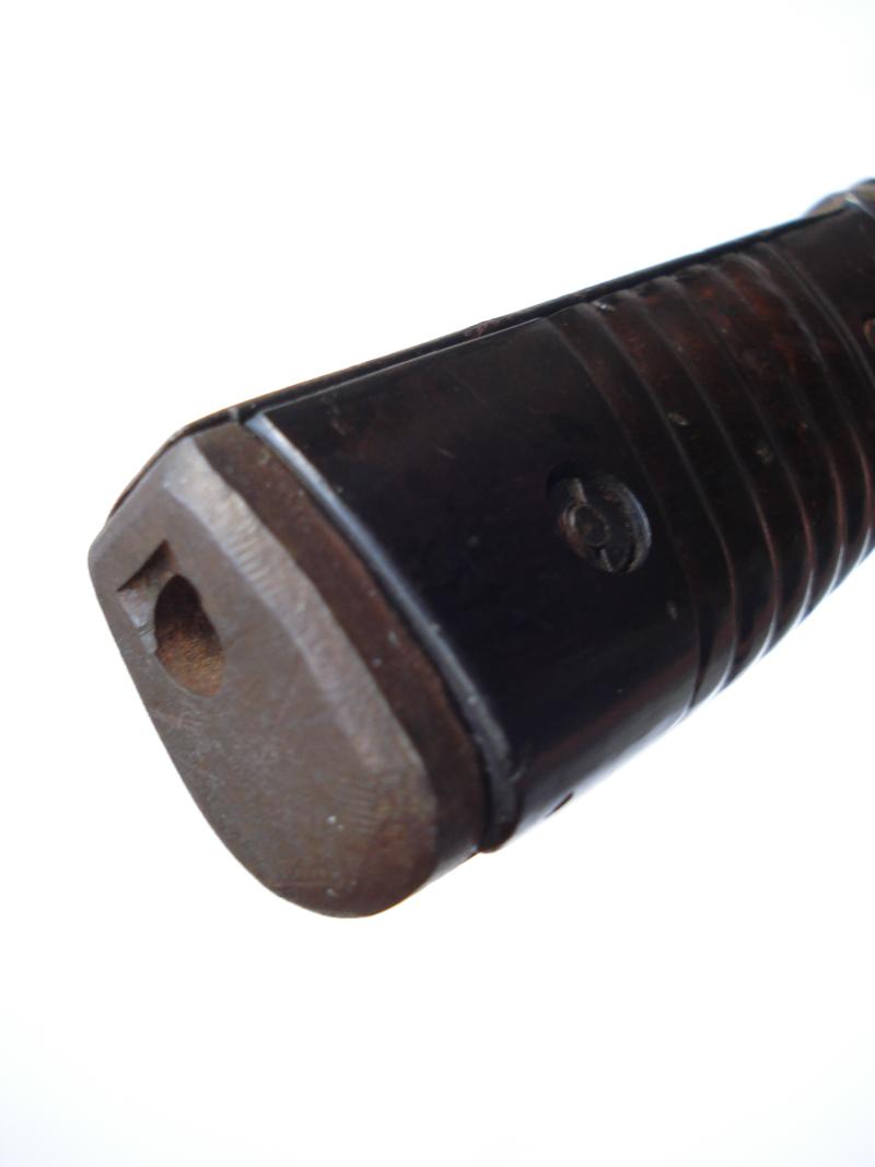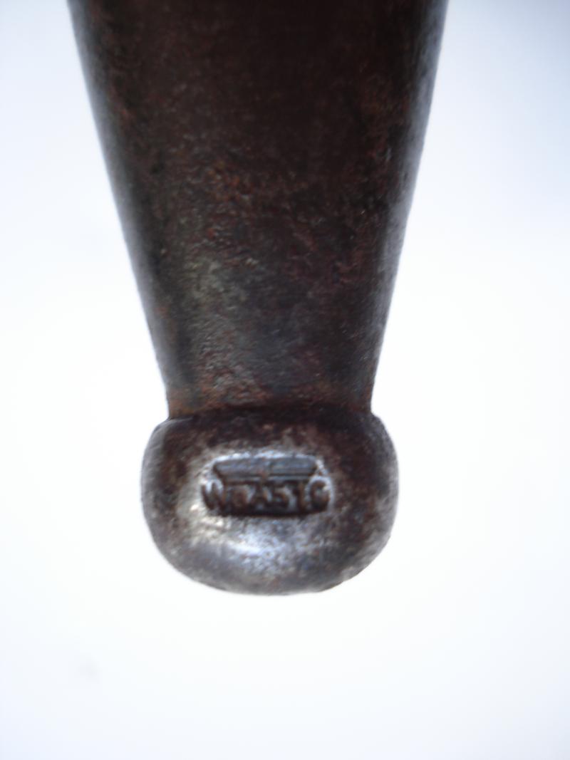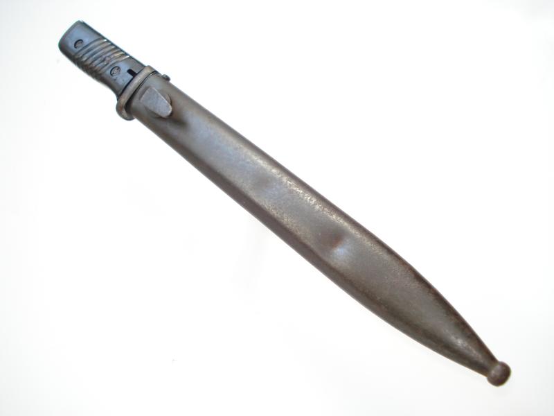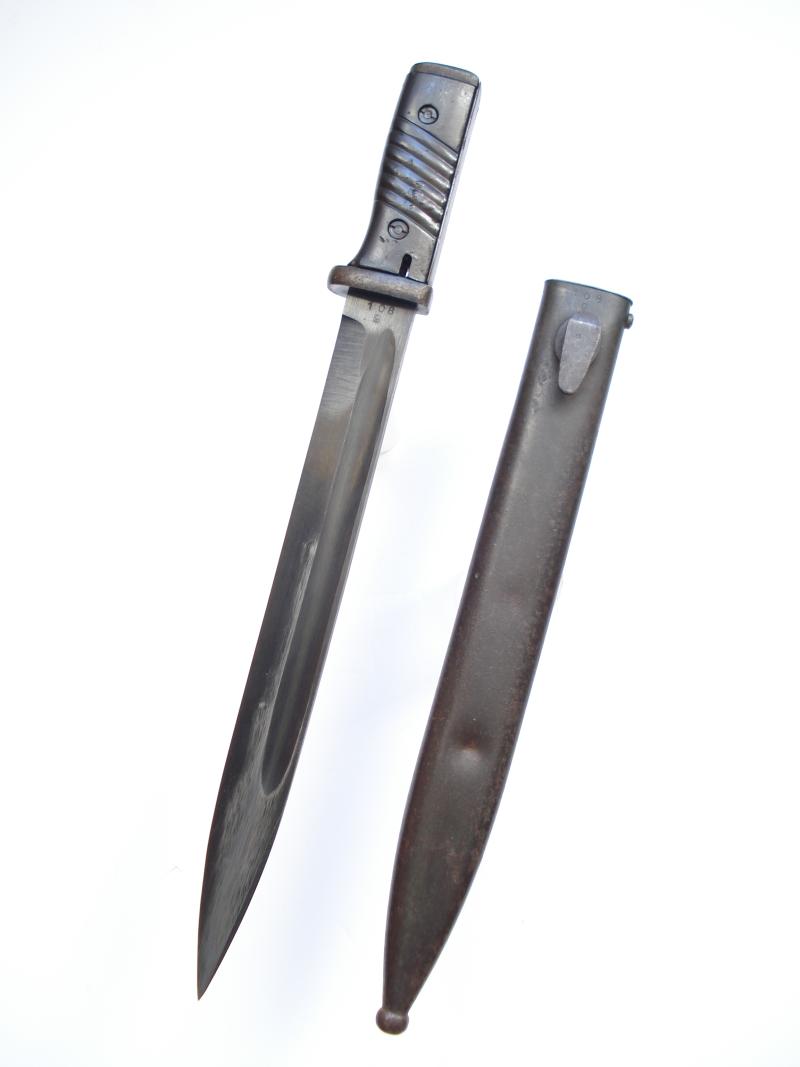 A 1942 dated S84/98 bayonet for the K98 that has been period converted to a fighting knife by the removal of the pommel/press stud. Possibly done due to battle damage.