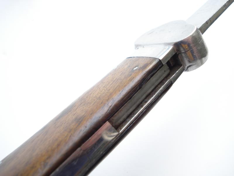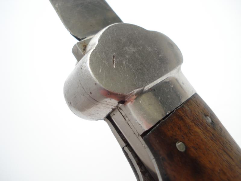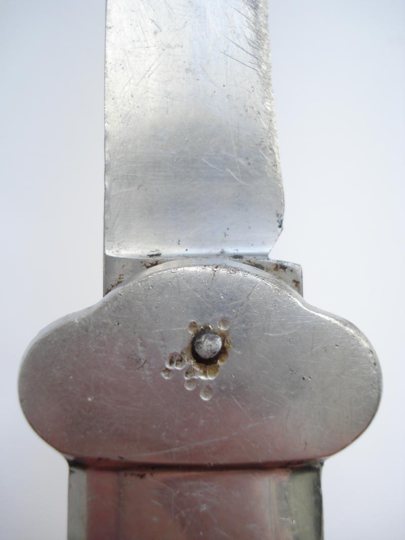 WW2 German gravity knife that has had the blade drilled & pegged to become a fixed blade knife. Not a recent conversion, carried out some time in the past, probably after the drop/lock mechanism was broken.