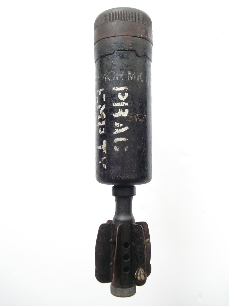 Post-War, 1950's dated British 2-Inch practice mortar round. Very good condition with the bulk of its original finish & stenciled markings. INERT/F.F.E