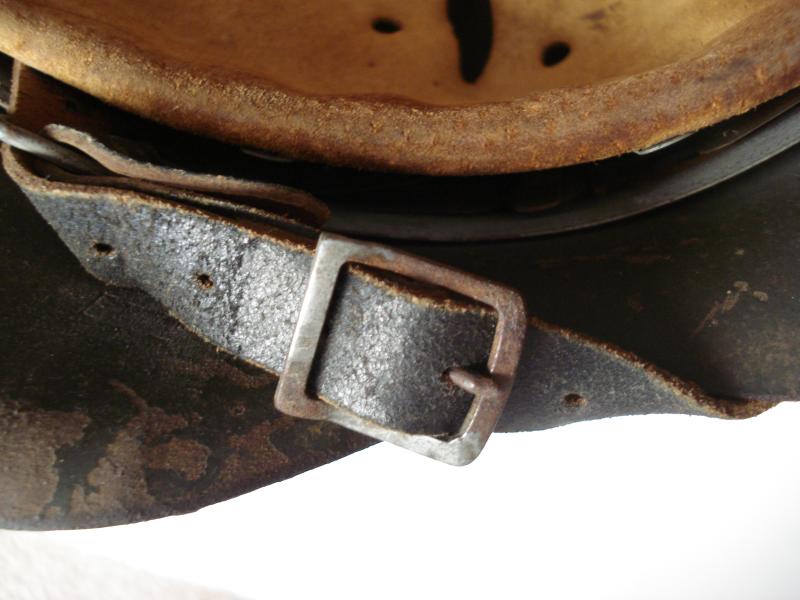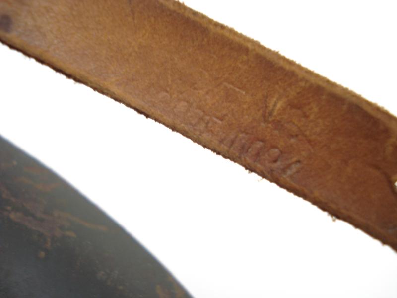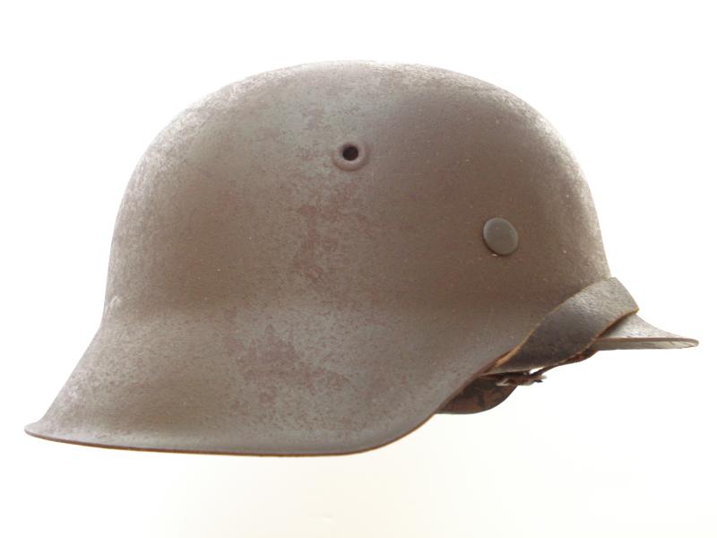 Good, untouched M42, single decal helmet. All complete, has its original liner drawstring, no missing or damaged liner tongues, original chinstrap. No weak or broken leather work. The liner pins totally undisturbed. Shell maker marked 'ET'