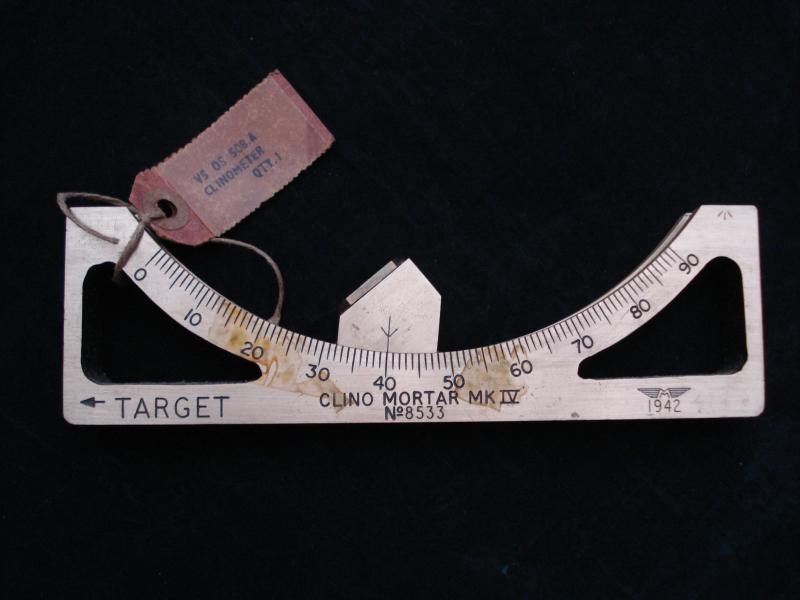 WW2 British MkIV Mortar Clinometer 1942 dated British, brass MkIV mortar clinometer in 1960's dated primary packaging. Nice makers mark/date. Mint, new old stock.